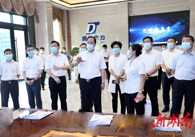 (8月17日,省委副书记、省长毛伟明来到湘潭市调研。图为毛伟明在湘乡市中部电力科技产业园腾达电力建设有限公司调研。)